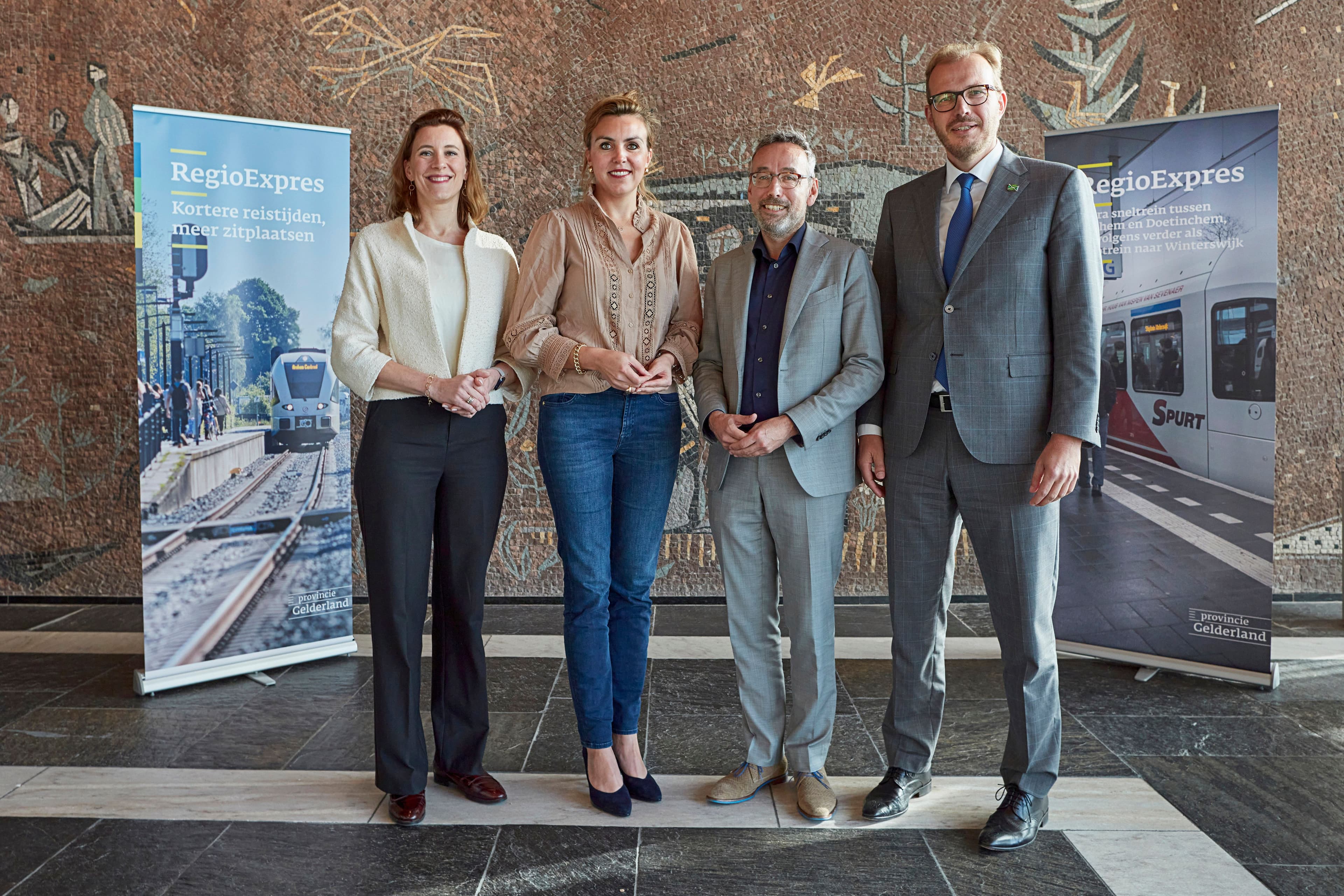 Op de foto van links naar rechts: directeur ProRail Noord en Oost Nederland, Danou Veenhof; staatssecretaris I&W Vivianne Heijnen; gedeputeerde openbaar vervoer Jan van der Meer en Mark Boumans, voorzitter regio Achterhoek (8RHK ambassadeurs).