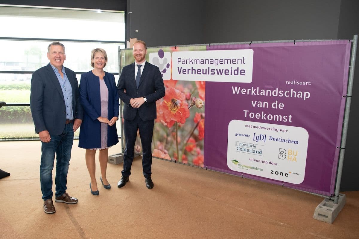 Het bedrijventerrein Verheulsweide in Doetinchem krijgt een opknapbeurt. Paul Stortelder van Parkmanagement Verheulsweide, wethouder Robbert Hummelink van Doetinchem en gedeputeerde Economie Helga Witjes onthulden het projectbord. De werkzaamheden zijn eind 2026 klaar.
