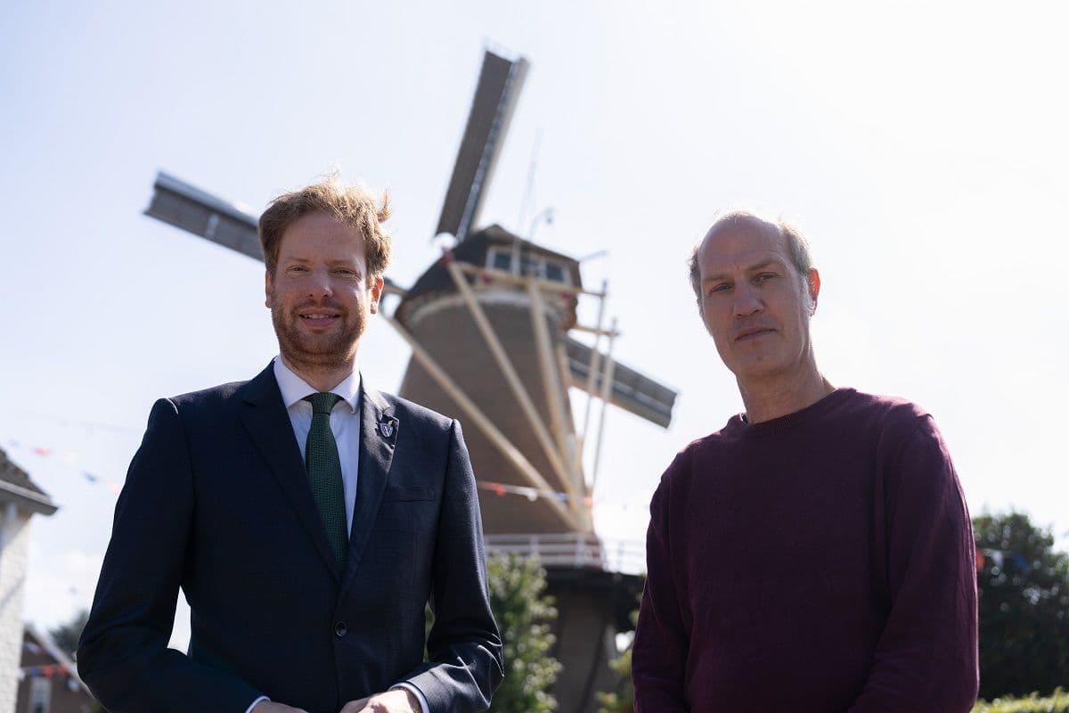 Bijschrift foto: burgemeester Floor Vermeulen en Wethouder Guido van Vulpen voor molen De Vlijt in Wageningen.
