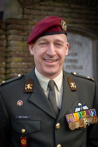 Fotobijschrift: Veteraan majoor Michel van Putten bij het Anjerperkje in Elst.
