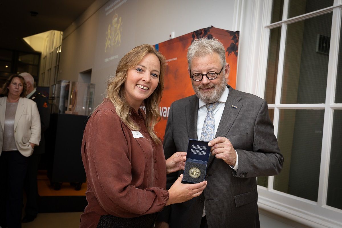 Veteraan Nadine Ermers ontvangt de Gelderse veteranenpenning uit handen van gedeputeerde Vrijheid, Peter Drenth.