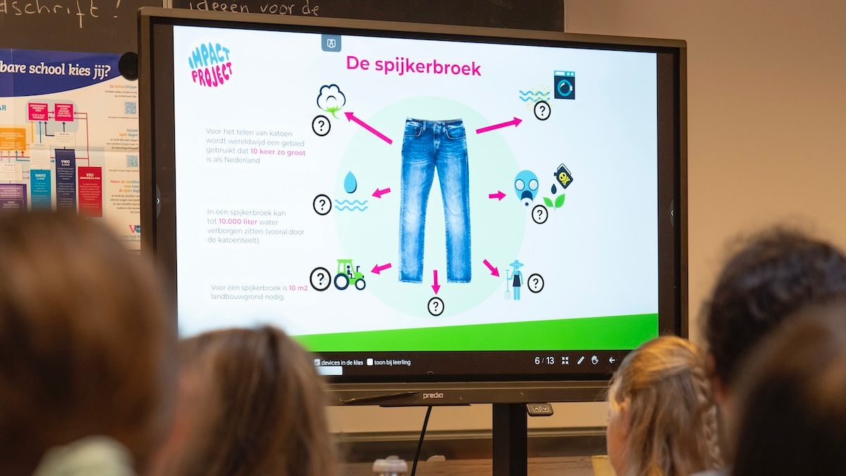 Hoeveel water kost het om een spijkerbroek te maken? Waar komen de onderdelen in je telefoon vandaan? En welk effect heeft het groener maken van je tuin of balkon? Met het ImpactProject van stichting Think Big Act Now ontdekken leerlingen de verrassende en vaak onzichtbare impact van dagelijkse keuzes. In 5 lessen gaan ze aan de slag met actuele onderwerpen zoals voeding, reizen en elektronica. Met onderzoek, creatieve opdrachten en discussie leren ze op een actieve manier over duurzaamheid.