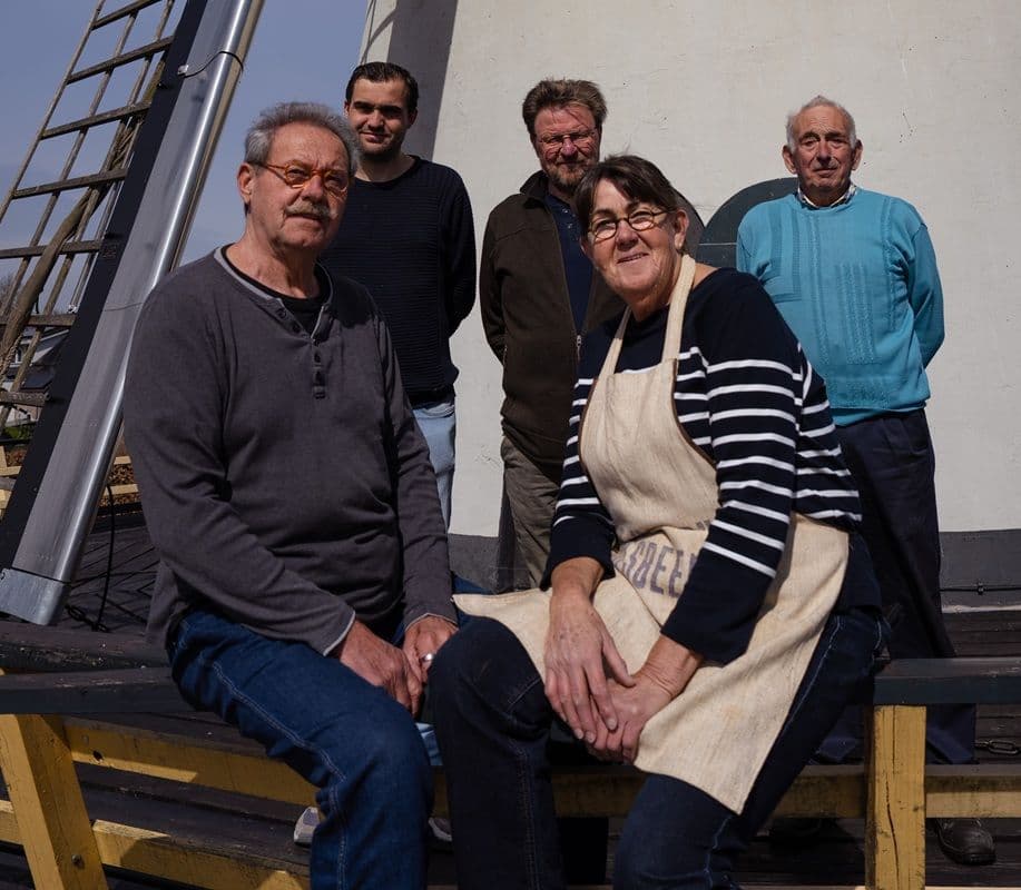 Op de achterste rij van links naar rechts molenaars Mark Leenders, Ronald Wieggers en Wim Tieben. Vooraan molenaar Koos van Hal met zijn vrouw Patty van Hal, vrijwilliger meel en eieren verkoop. Op de foto ontbreekt vrijwilliger Truus Peters.