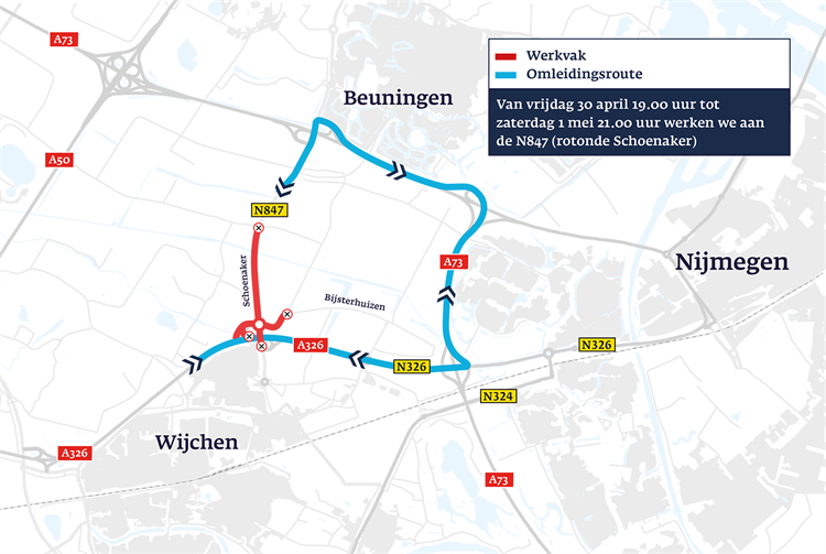Tijdens de werkzaamheden zijn de Schoenaker en de op- en afritten van de A326 bij Wijchen afgesloten voor verkeer. Doorgaand verkeer leiden we om via de A326 en de A73. Bestemmingsverkeer leiden we lokaal om via borden langs de weg.